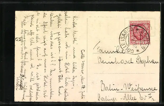 Personenbezogene Daten auf der Rückseite der Karte wurden durch blauen Textmarker unkenntlich gemacht. Die blauen Stellen sind auf die Vorderseite durchgeweicht und wirken sich negativ auf das Postkartenfoto aus