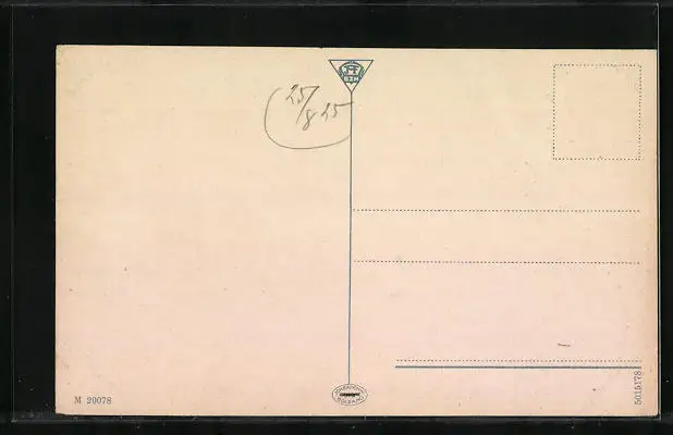 Personenbezogene Daten auf der Rückseite der Karte wurden durch blauen Textmarker unkenntlich gemacht. Die blauen Stellen sind auf die Vorderseite durchgeweicht und wirken sich negativ auf das Postkartenfoto aus