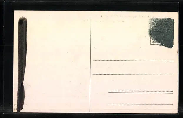 Personenbezogene Daten auf der Rückseite der Karte wurden durch blauen Textmarker unkenntlich gemacht. Die blauen Stellen sind auf die Vorderseite durchgeweicht und wirken sich negativ auf das Postkartenfoto aus
