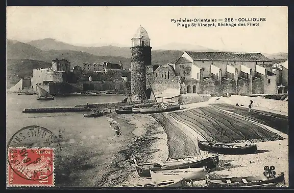 AK Collioure, Plage St-Vincent, Séchage des Filets