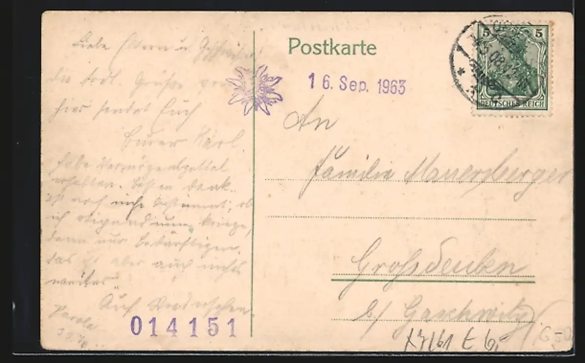 Personenbezogene Daten auf der Rückseite der Karte wurden durch blauen Textmarker unkenntlich gemacht. Die blauen Stellen sind auf die Vorderseite durchgeweicht und wirken sich negativ auf das Postkartenfoto aus