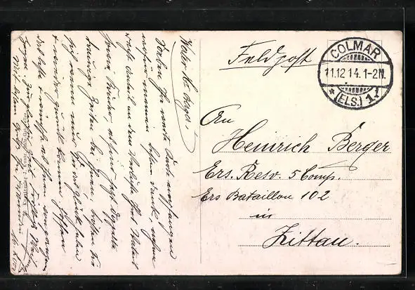 alte Ansichtskarte, gelaufen 1914 als Feldpost, Eckknicke oben, Stempelspur, guter Zustand