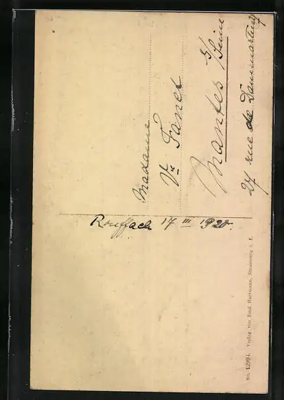 Personenbezogene Daten auf der Rückseite der Karte wurden durch blauen Textmarker unkenntlich gemacht. Die blauen Stellen sind auf die Vorderseite durchgeweicht und wirken sich negativ auf das Postkartenfoto aus