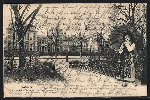 AK Colmar, Strasse am Bezirkspräsidium, Mädchen in Tracht & Schirm