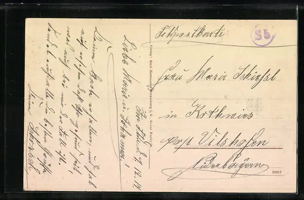 Personenbezogene Daten auf der Rückseite der Karte wurden durch blauen Textmarker unkenntlich gemacht. Die blauen Stellen sind auf die Vorderseite durchgeweicht und wirken sich negativ auf das Postkartenfoto aus