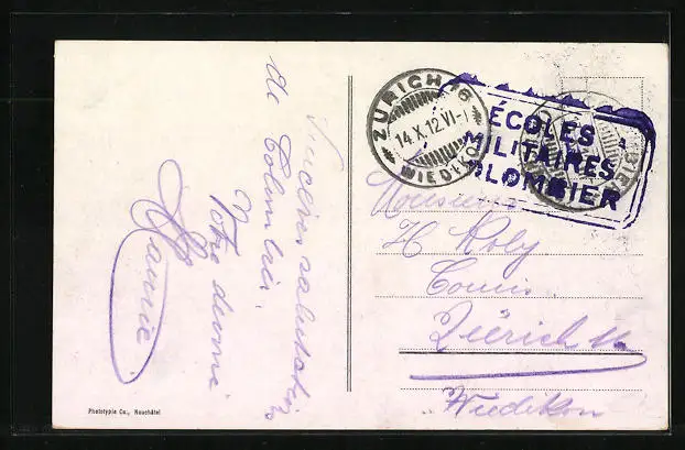 Personenbezogene Daten auf der Rückseite der Karte wurden durch blauen Textmarker unkenntlich gemacht. Die blauen Stellen sind auf die Vorderseite durchgeweicht und wirken sich negativ auf das Postkartenfoto aus