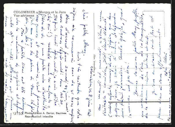 Personenbezogene Daten auf der Rückseite der Karte wurden durch blauen Textmarker unkenntlich gemacht. Die blauen Stellen sind auf die Vorderseite durchgeweicht und wirken sich negativ auf das Postkartenfoto aus