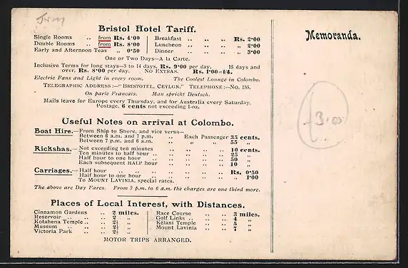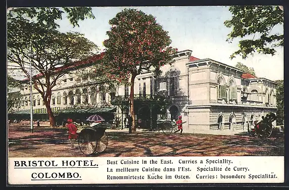 AK Colombo, Bristol Hotel, Eingangsfassade mit Rikschas