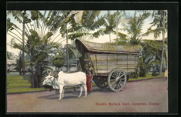 AK Colombo, Double Bullock Cart, Ochsen-Gespann auf einer Strasse
