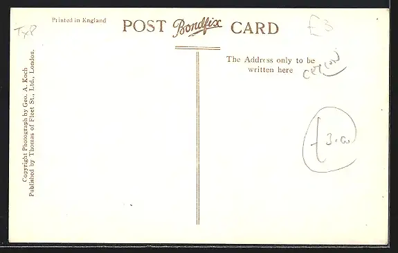Personenbezogene Daten auf der Rückseite der Karte wurden durch blauen Textmarker unkenntlich gemacht. Die blauen Stellen sind auf die Vorderseite durchgeweicht und wirken sich negativ auf das Postkartenfoto aus