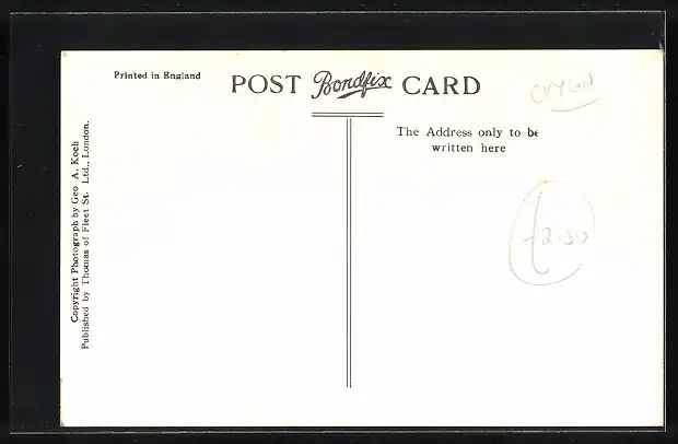 Personenbezogene Daten auf der Rückseite der Karte wurden durch blauen Textmarker unkenntlich gemacht. Die blauen Stellen sind auf die Vorderseite durchgeweicht und wirken sich negativ auf das Postkartenfoto aus