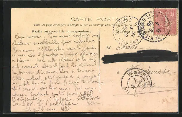 Personenbezogene Daten auf der Rückseite der Karte wurden durch blauen Textmarker unkenntlich gemacht. Die blauen Stellen sind auf die Vorderseite durchgeweicht und wirken sich negativ auf das Postkartenfoto aus