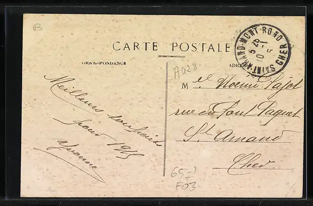 Personenbezogene Daten auf der Rückseite der Karte wurden durch blauen Textmarker unkenntlich gemacht. Die blauen Stellen sind auf die Vorderseite durchgeweicht und wirken sich negativ auf das Postkartenfoto aus