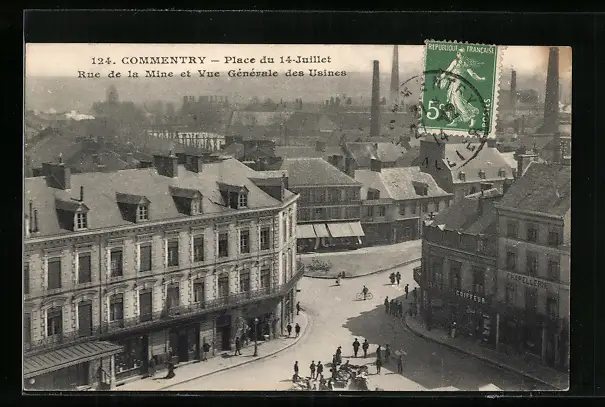 AK Commentry, Place du 14-Juillet, Rue de la Mine et Vue Gènèrale des Usines