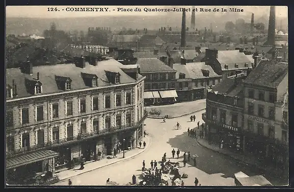 AK Commentry, Place du Quatorze-Juillet et Rue de la Mine