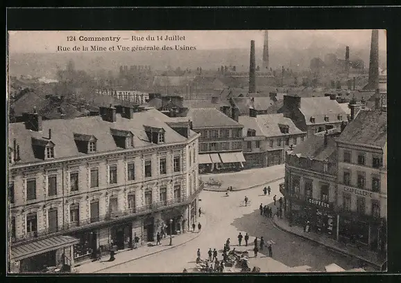 AK Commentry, Rue du 14 Juillet, Rue de la Mine et Vue generale des Usines