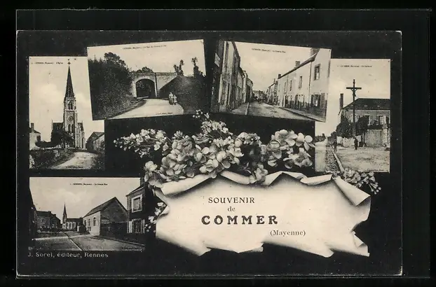 AK Commer, Ortspartie mit Kirche, Strassenpartie mit Geschäften