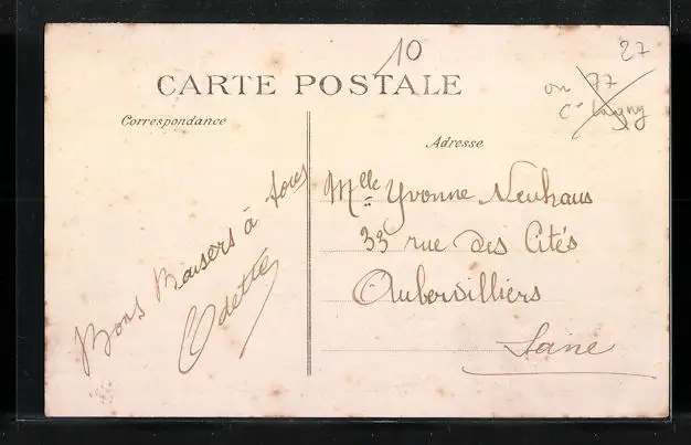 Personenbezogene Daten auf der Rückseite der Karte wurden durch blauen Textmarker unkenntlich gemacht. Die blauen Stellen sind auf die Vorderseite durchgeweicht und wirken sich negativ auf das Postkartenfoto aus
