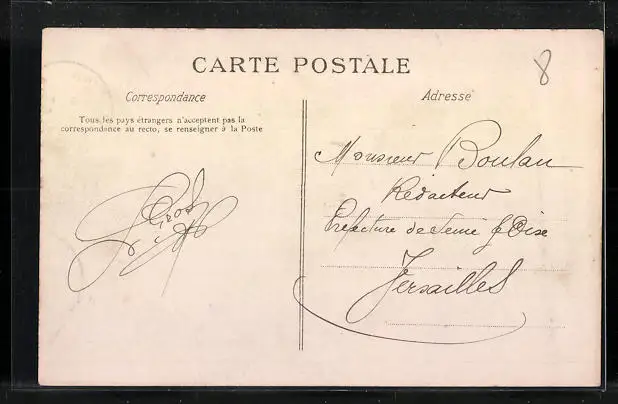 Personenbezogene Daten auf der Rückseite der Karte wurden durch blauen Textmarker unkenntlich gemacht. Die blauen Stellen sind auf die Vorderseite durchgeweicht und wirken sich negativ auf das Postkartenfoto aus
