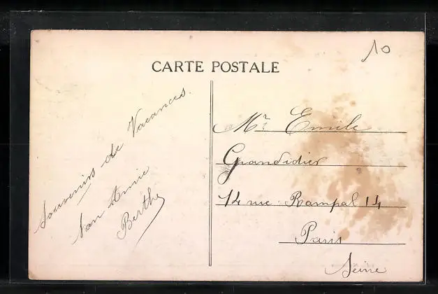Personenbezogene Daten auf der Rückseite der Karte wurden durch blauen Textmarker unkenntlich gemacht. Die blauen Stellen sind auf die Vorderseite durchgeweicht und wirken sich negativ auf das Postkartenfoto aus