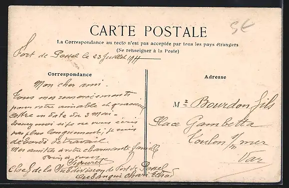 Personenbezogene Daten auf der Rückseite der Karte wurden durch blauen Textmarker unkenntlich gemacht. Die blauen Stellen sind auf die Vorderseite durchgeweicht und wirken sich negativ auf das Postkartenfoto aus