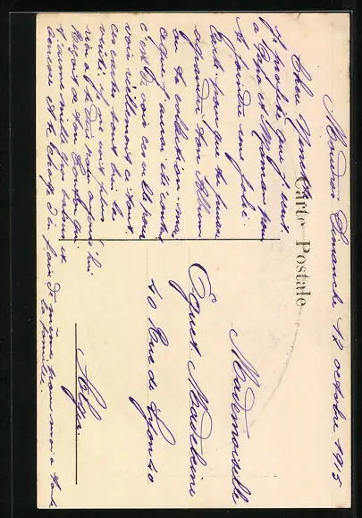 Personenbezogene Daten auf der Rückseite der Karte wurden durch blauen Textmarker unkenntlich gemacht. Die blauen Stellen sind auf die Vorderseite durchgeweicht und wirken sich negativ auf das Postkartenfoto aus