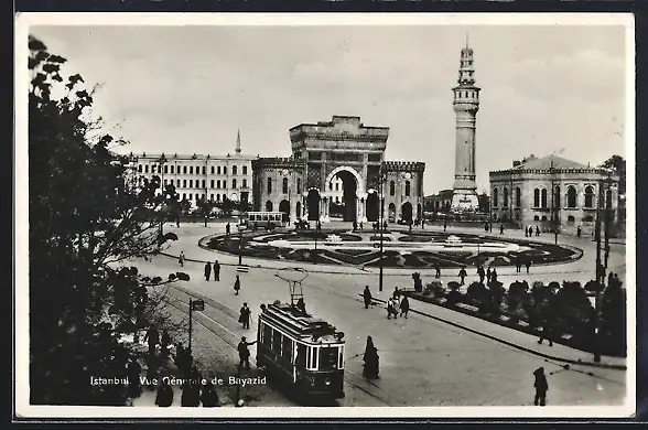 AK Constantinople / Konstantinopel, Vue générale de Beyazit, Strassenbahn und Triumphbogen