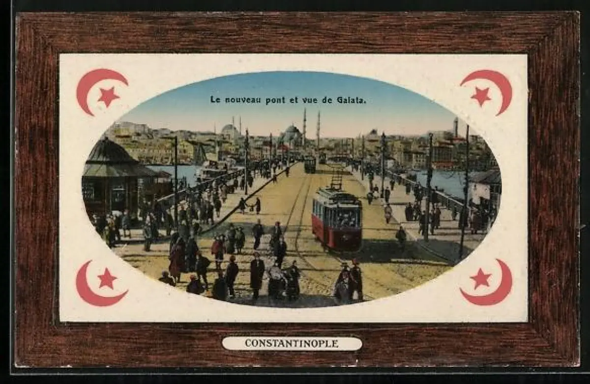 AK Constantinople, Le nouveau pont et vue de Galata, Strassenbahn