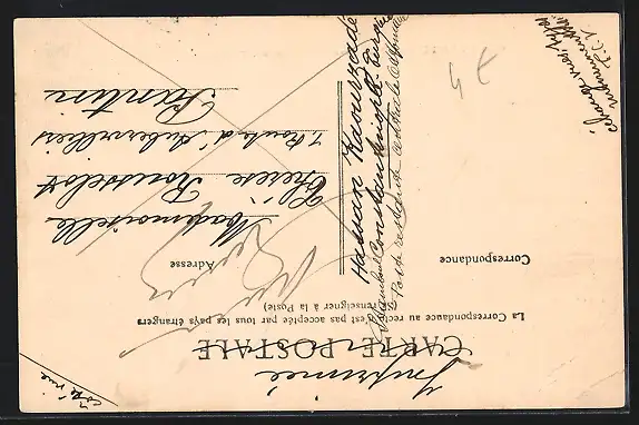 Personenbezogene Daten auf der Rückseite der Karte wurden durch blauen Textmarker unkenntlich gemacht. Die blauen Stellen sind auf die Vorderseite durchgeweicht und wirken sich negativ auf das Postkartenfoto aus