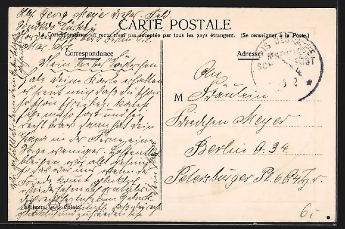 Personenbezogene Daten auf der Rückseite der Karte wurden durch blauen Textmarker unkenntlich gemacht. Die blauen Stellen sind auf die Vorderseite durchgeweicht und wirken sich negativ auf das Postkartenfoto aus