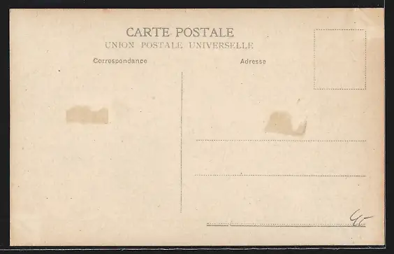 Personenbezogene Daten auf der Rückseite der Karte wurden durch blauen Textmarker unkenntlich gemacht. Die blauen Stellen sind auf die Vorderseite durchgeweicht und wirken sich negativ auf das Postkartenfoto aus
