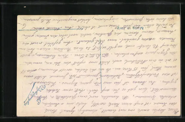 Personenbezogene Daten auf der Rückseite der Karte wurden durch blauen Textmarker unkenntlich gemacht. Die blauen Stellen sind auf die Vorderseite durchgeweicht und wirken sich negativ auf das Postkartenfoto aus
