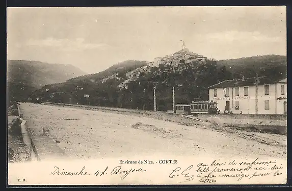 AK Contes, Vue du village avec tramway et collines environnantes