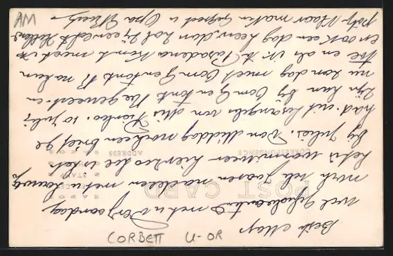 Personenbezogene Daten auf der Rückseite der Karte wurden durch blauen Textmarker unkenntlich gemacht. Die blauen Stellen sind auf die Vorderseite durchgeweicht und wirken sich negativ auf das Postkartenfoto aus