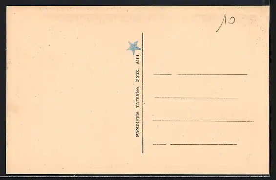 Personenbezogene Daten auf der Rückseite der Karte wurden durch blauen Textmarker unkenntlich gemacht. Die blauen Stellen sind auf die Vorderseite durchgeweicht und wirken sich negativ auf das Postkartenfoto aus