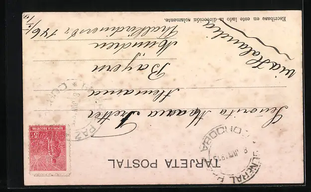Personenbezogene Daten auf der Rückseite der Karte wurden durch blauen Textmarker unkenntlich gemacht. Die blauen Stellen sind auf die Vorderseite durchgeweicht und wirken sich negativ auf das Postkartenfoto aus