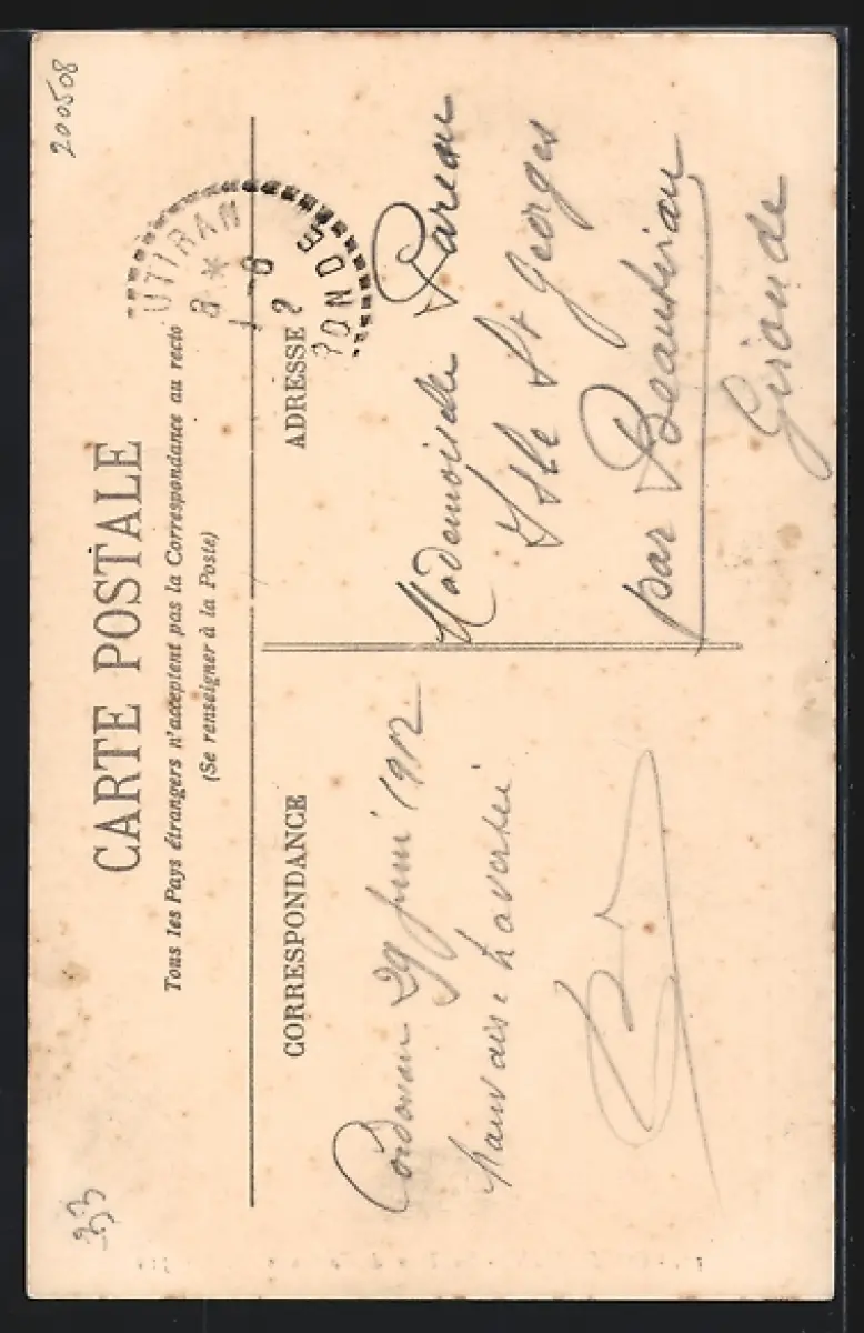Personenbezogene Daten auf der Rückseite der Karte wurden durch blauen Textmarker unkenntlich gemacht. Die blauen Stellen sind auf die Vorderseite durchgeweicht und wirken sich negativ auf das Postkartenfoto aus
