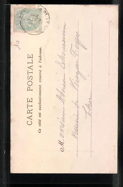 Personenbezogene Daten auf der Rückseite der Karte wurden durch blauen Textmarker unkenntlich gemacht. Die blauen Stellen sind auf die Vorderseite durchgeweicht und wirken sich negativ auf das Postkartenfoto aus