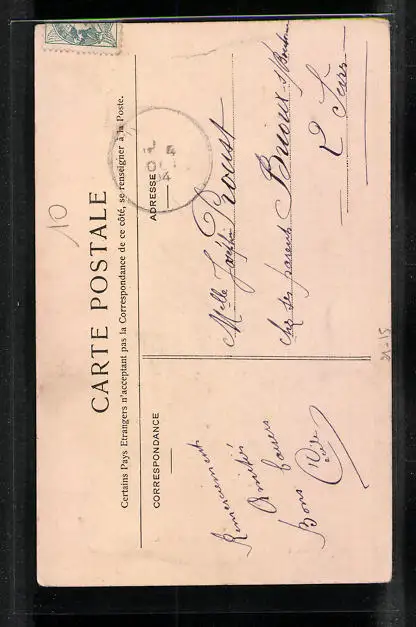 Personenbezogene Daten auf der Rückseite der Karte wurden durch blauen Textmarker unkenntlich gemacht. Die blauen Stellen sind auf die Vorderseite durchgeweicht und wirken sich negativ auf das Postkartenfoto aus