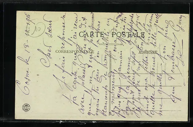 Personenbezogene Daten auf der Rückseite der Karte wurden durch blauen Textmarker unkenntlich gemacht. Die blauen Stellen sind auf die Vorderseite durchgeweicht und wirken sich negativ auf das Postkartenfoto aus