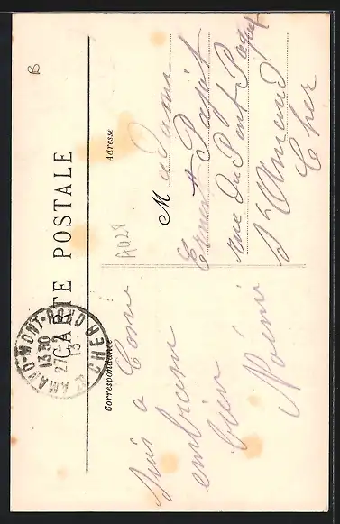 Personenbezogene Daten auf der Rückseite der Karte wurden durch blauen Textmarker unkenntlich gemacht. Die blauen Stellen sind auf die Vorderseite durchgeweicht und wirken sich negativ auf das Postkartenfoto aus