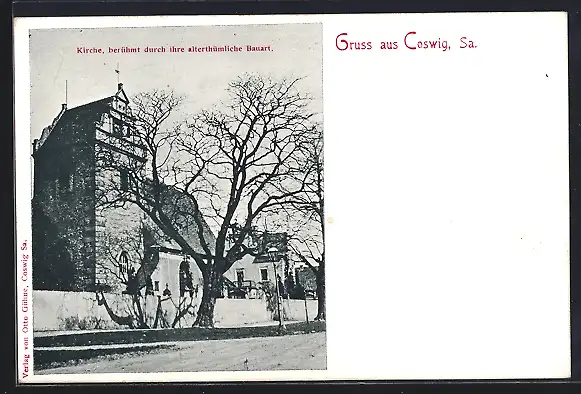 AK Coswig /Sa., Ortspartie mit Kirche