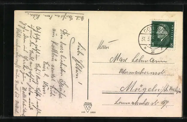 Personenbezogene Daten auf der Rückseite der Karte wurden durch blauen Textmarker unkenntlich gemacht. Die blauen Stellen sind auf die Vorderseite durchgeweicht und wirken sich negativ auf das Postkartenfoto aus