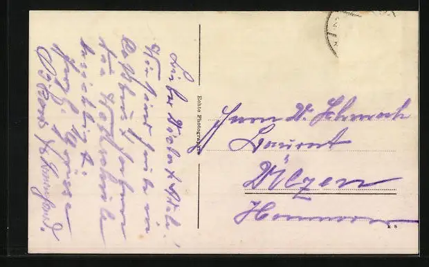 Personenbezogene Daten auf der Rückseite der Karte wurden durch blauen Textmarker unkenntlich gemacht. Die blauen Stellen sind auf die Vorderseite durchgeweicht und wirken sich negativ auf das Postkartenfoto aus
