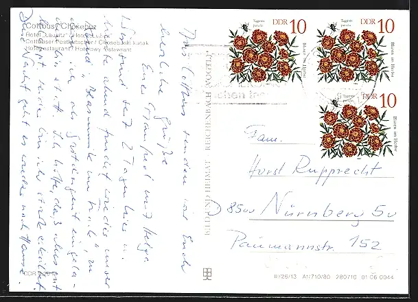 Personenbezogene Daten auf der Rückseite der Karte wurden durch blauen Textmarker unkenntlich gemacht. Die blauen Stellen sind auf die Vorderseite durchgeweicht und wirken sich negativ auf das Postkartenfoto aus
