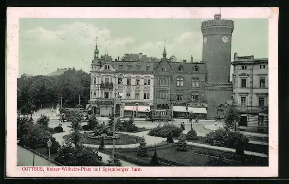 AK Cottbus, Kaiser-Wilhelm-Platz mit Spremberger Turm
