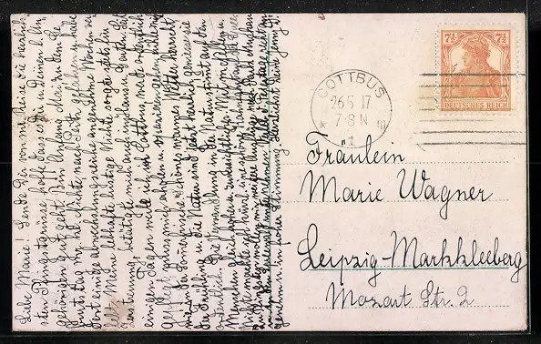 Personenbezogene Daten auf der Rückseite der Karte wurden durch blauen Textmarker unkenntlich gemacht. Die blauen Stellen sind auf die Vorderseite durchgeweicht und wirken sich negativ auf das Postkartenfoto aus