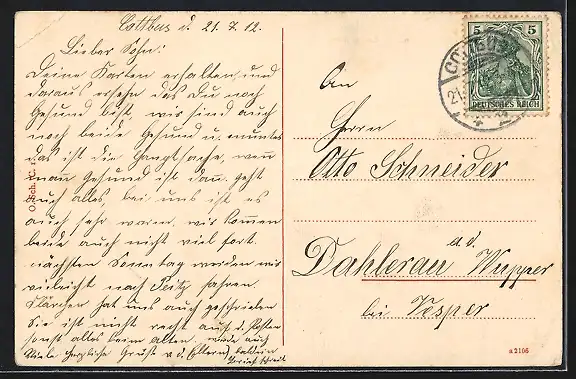 alte Ansichtskarte, gelaufen 1912, Eckknick oben re., guter Zustand
