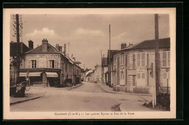 AK Coubert, Les quatres Routes et Rue de la Poste