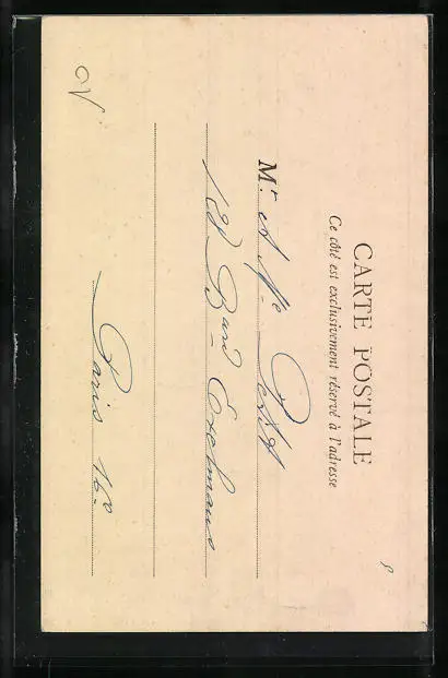 Personenbezogene Daten auf der Rückseite der Karte wurden durch blauen Textmarker unkenntlich gemacht. Die blauen Stellen sind auf die Vorderseite durchgeweicht und wirken sich negativ auf das Postkartenfoto aus